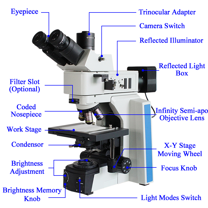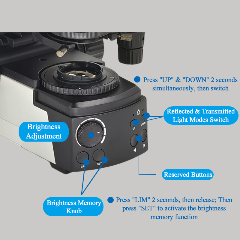 Infinity Semi-apochromatic optical system; Optional 50X~1000X; Coded Nosepiece; Light Brightness Memory Function