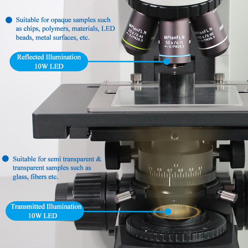 It also provides observation in reflected or transmitted and mixed illumination, operating bright field observation, polarizing observation, dark field observation (optional). 10W LED light illumination for high brightness, high resolution, and positive color reproduction of images.